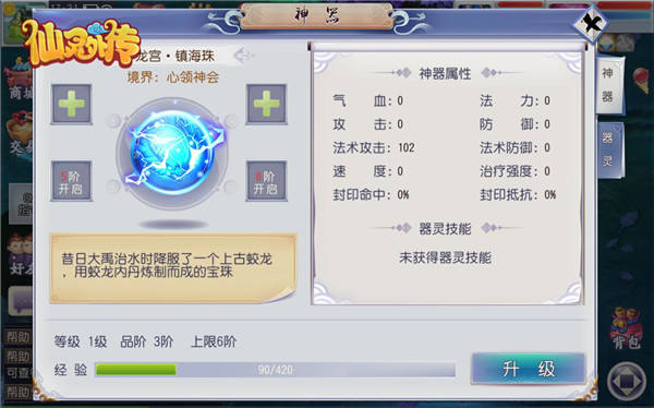获得神器后,神器的属性会直接增加玩家当前属性,神器共有10阶,每阶6个等级,达到6级且经验值满时才可进阶,每次升级和进阶都会提升属性。